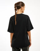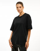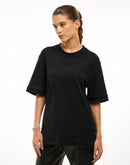 Oversized tipo marškinėliai trumpomis rankovėmis. Priekyje išsiuvinėta frazė „glow black", nugaroje - JUODA VARNA logotipas.