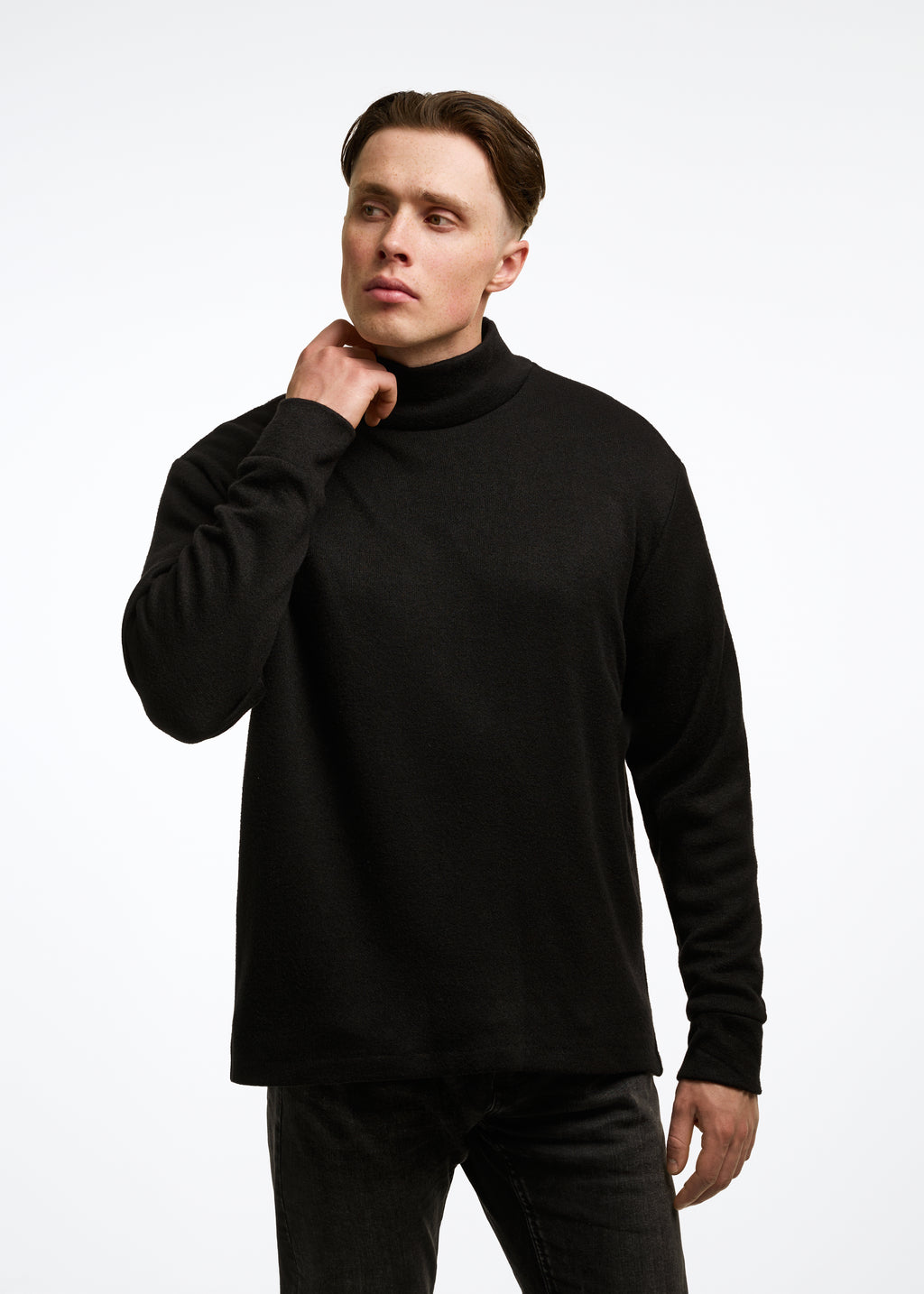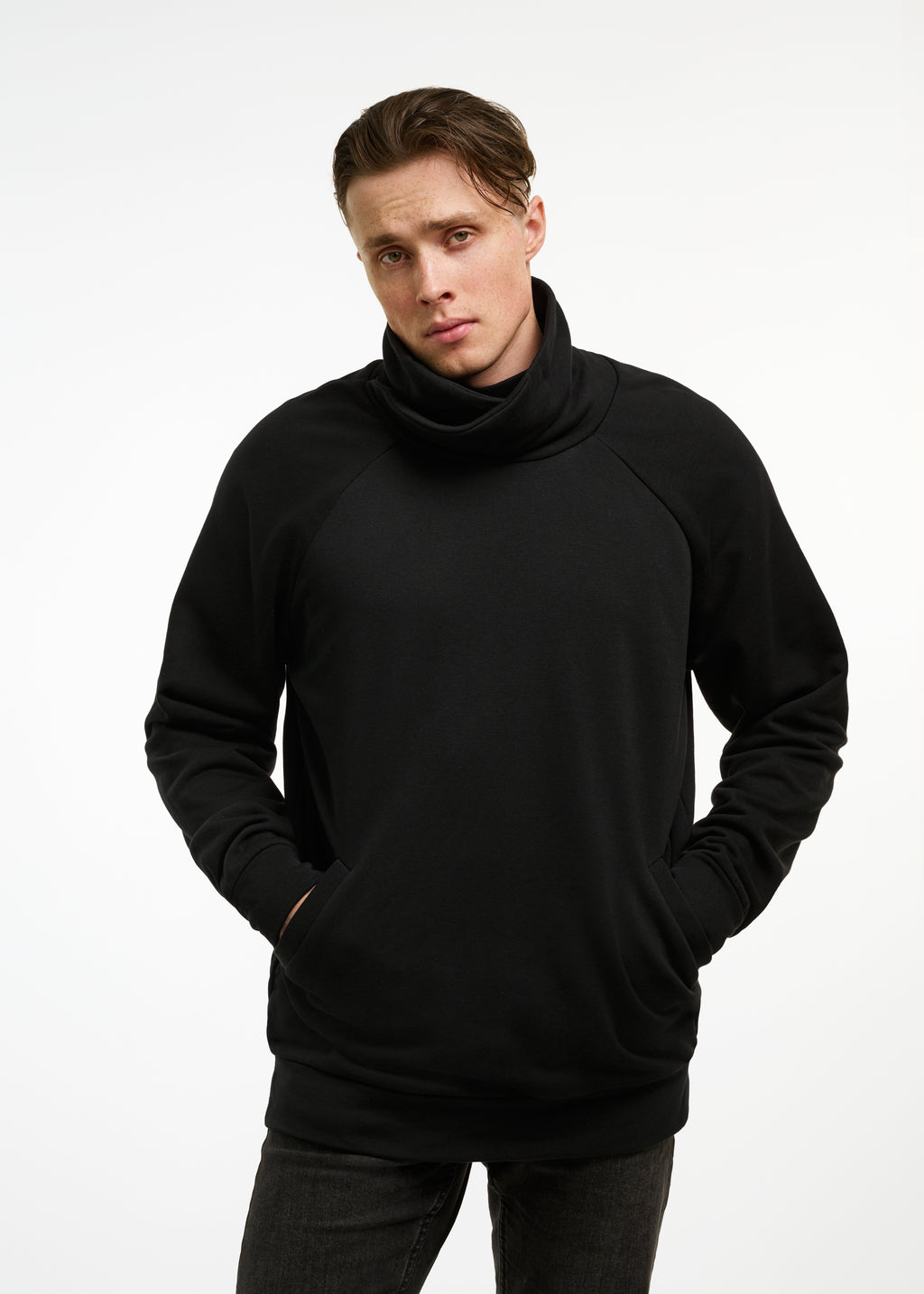 Džemperis aukštu kaklu su kišenėmis.
