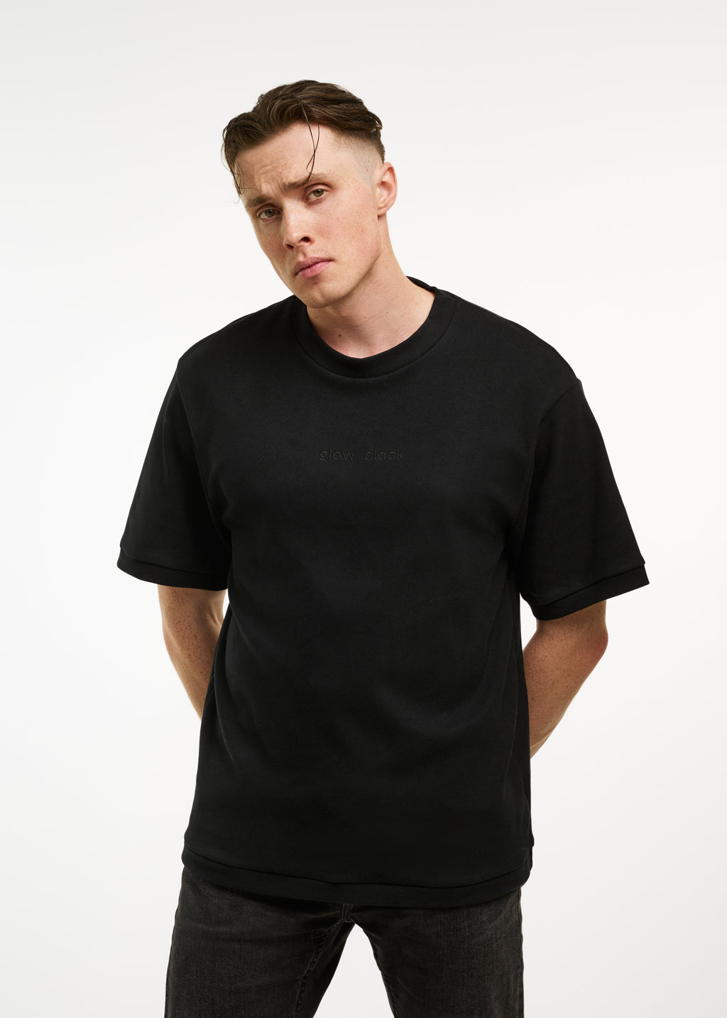 Marškinėliai trumpomis rankovėmis. Priekyje išsiuvinėta frazė „glow black", nugaroje – JUODA VARNA logotipas.Sudėtis: